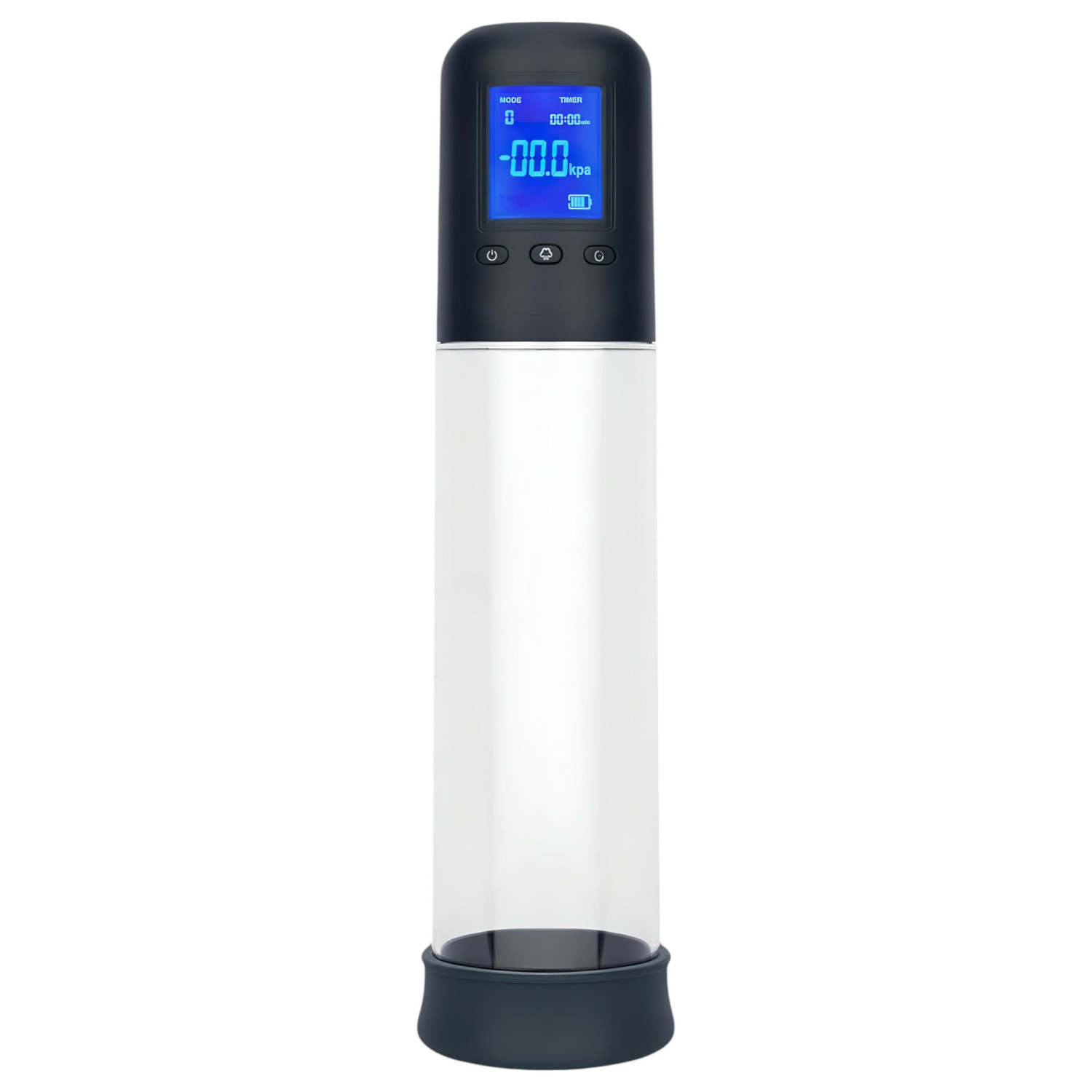 Folosind cele trei butoane de sub display-ul digital poți ajusta puterea de aspirație și modurile de vibrație. Butonul din stânga (power) pornește sau oprește pompa când e ținut apăsat, cu butonul din mijloc (+) schimbi modurile de aspirație, iar cel din dreapta (-) elimină vacuumul.
