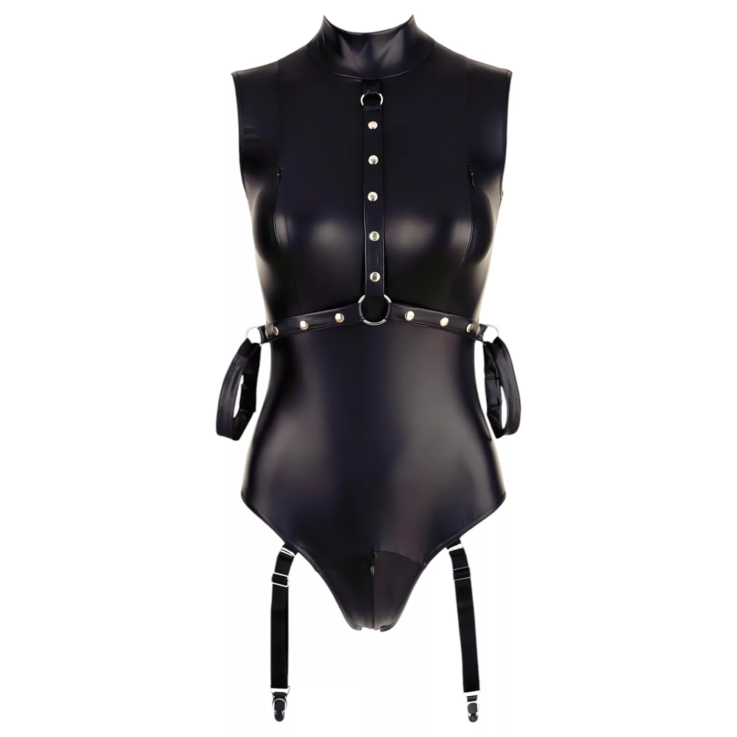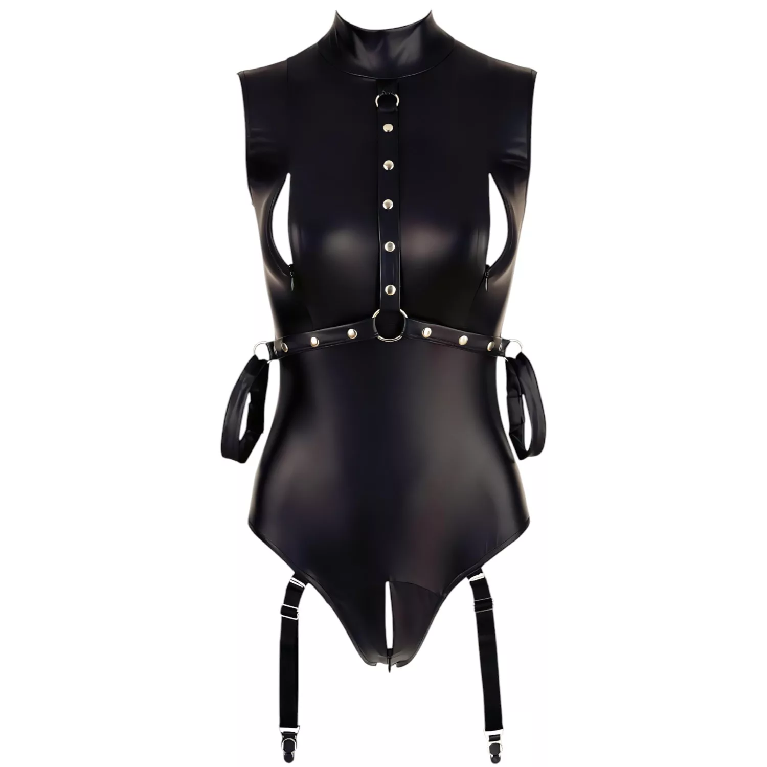 Cottelli Bondage - body lucios fără mâneci cu cătușe pentru mâini - negru - XL