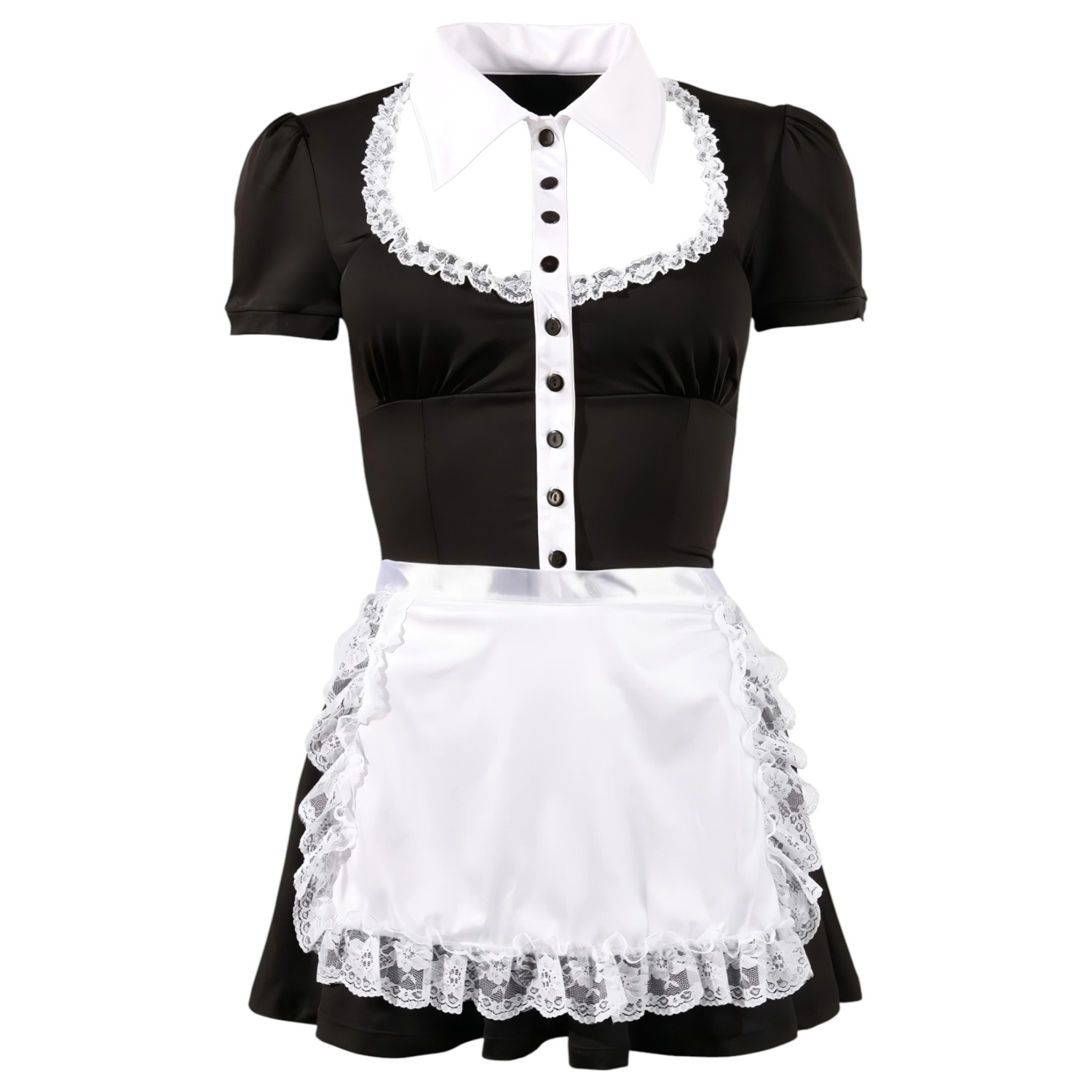 Această rochiță mini neagră, inspirată de stilul de menajeră, e alegerea perfectă dacă vrei un look sexy și jucăuș.