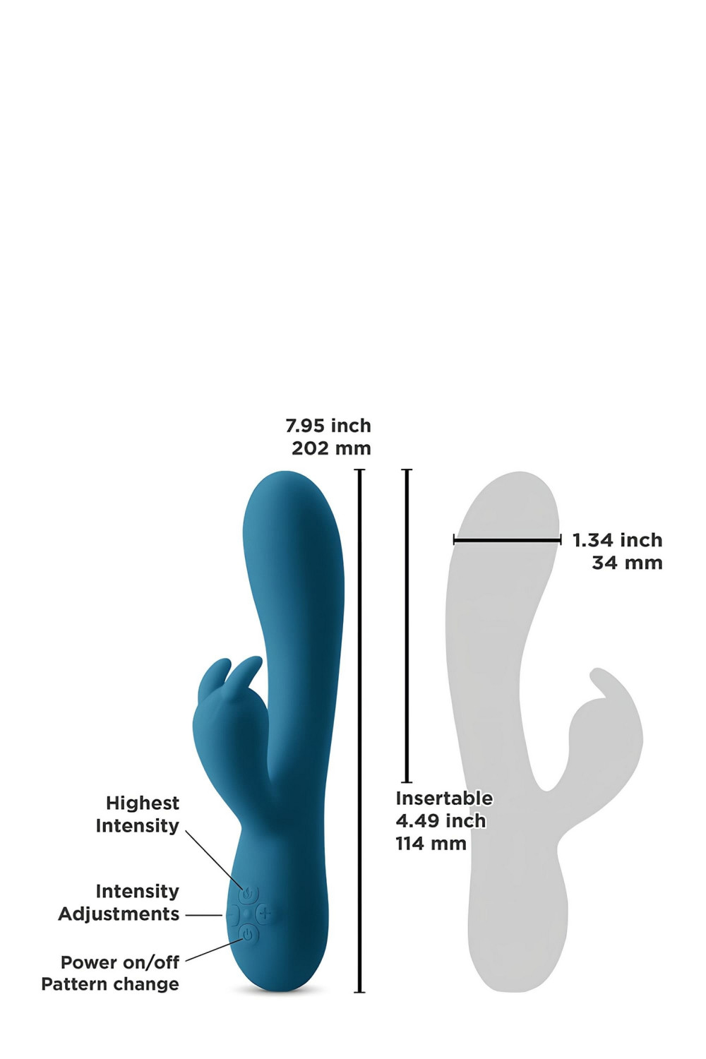 Partea lungă, curbată se introduce în vagin cu capătul curbat orientat în sus, spre tine. Partea plată cu cele două “urechiușe” se așază pe clitoris. Pornești dispozitivul apăsând lung butonul cu simbol de undă, iar pentru a schimba modurile de vibrație apeși scurt.
