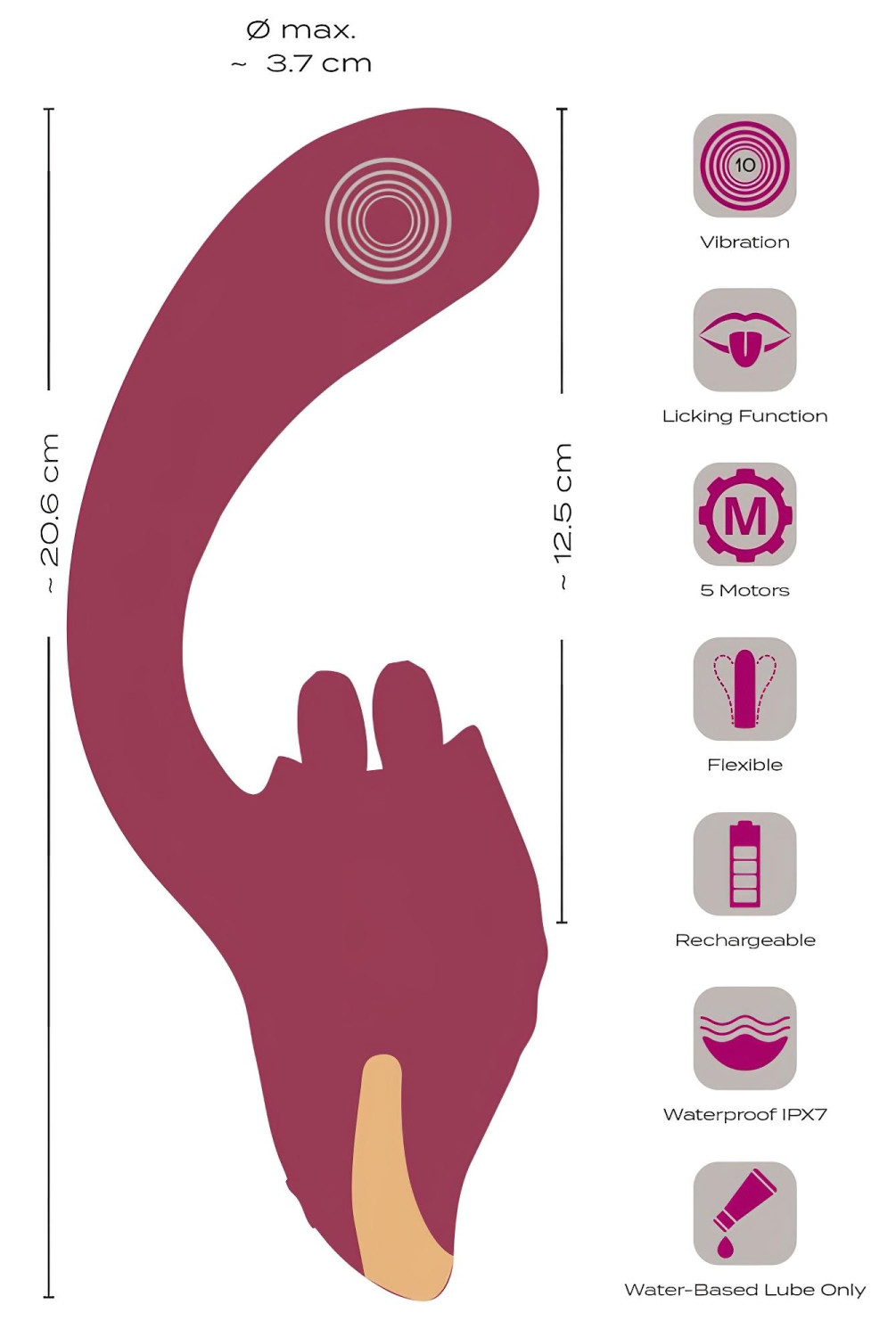 • Vibrații puternice și variate - 10 moduri de vibrații pe brațul curbat și 10 moduri de stimulare pe limbița dublă flexibilă pentru clitoris