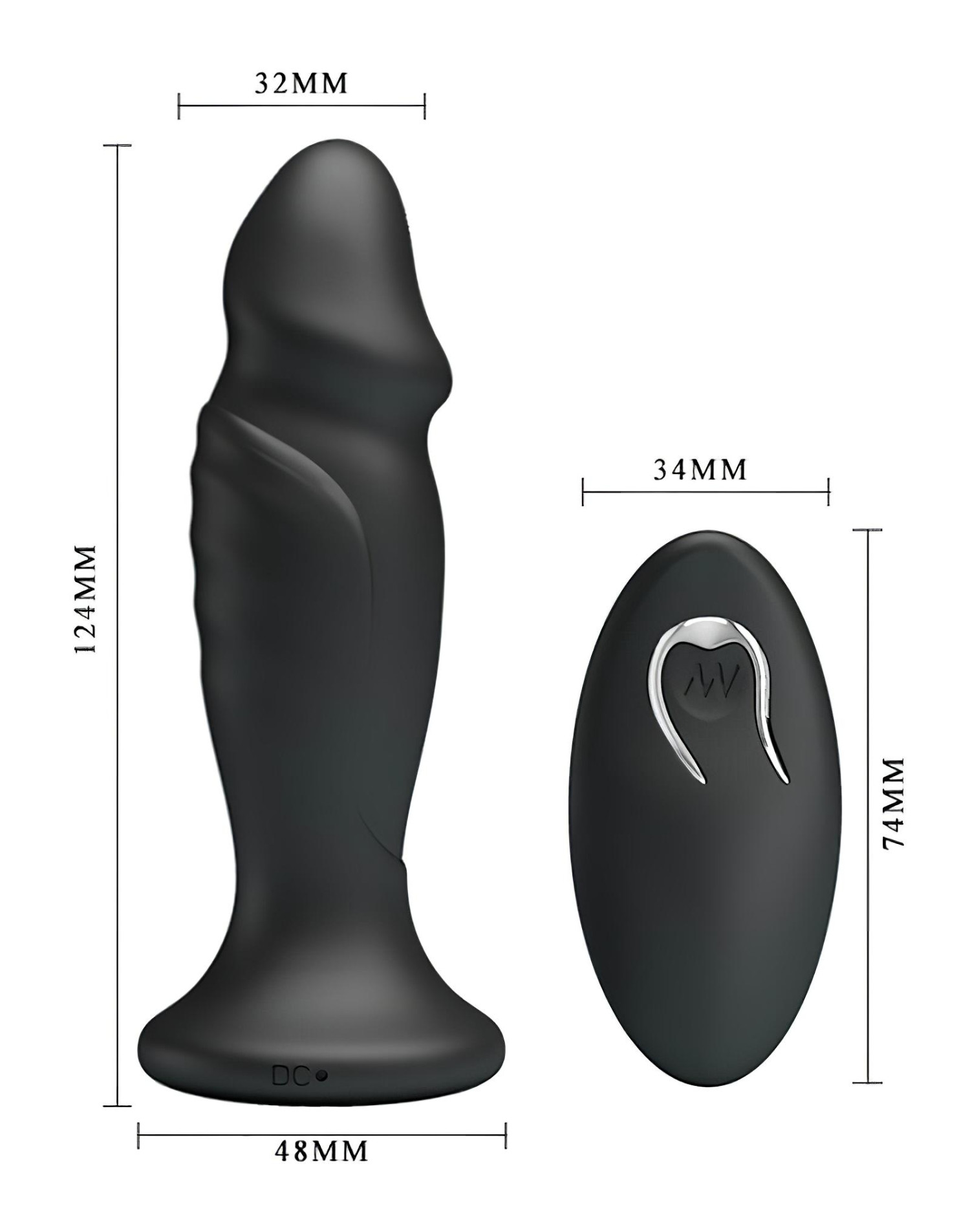 Cum se folosește:Aplică lubrifiant atât pe zona anală, cât și pe vibrator. După ce ți-ai pregătit bine zona, introdu vibratorul cu grijă, având grijă ca vârful curbat să fie orientat în sus, spre tine.Acum mai rămâne doar să pornești vibrația pentru senzații plăcute și incitante!Control:Pe bază găsești un singur buton. Ține-l apăsat mai lung pentru a porni produsul în standby. De aici poți folosi și telecomanda. Apasă scurt pentru a schimba modurile de vibrație. Ține apăsat mai lung pentru a-l opri complet.Control din telecomandă:Pune corect bateria în telecomandă. Pune vibratorul în modul standby cum am spus mai devreme. Apoi, apasă butonul de pe telecomandă pentru a porni vibrațiile și a schimba modurile. Pentru oprire completă, va trebui să ții apăsat butonul de pe vibrator, nu cel al telecomenzii.Încărcare:Se încarcă ușor cu cablul USB inclus.Conectorul USB se află pe partea laterală a bazei, lângă inscripția DC - găsești un mic orificiu pe care îl vei străpunge cu grijă cu mufa, înainte de prima utilizare.Specificații și detalii: