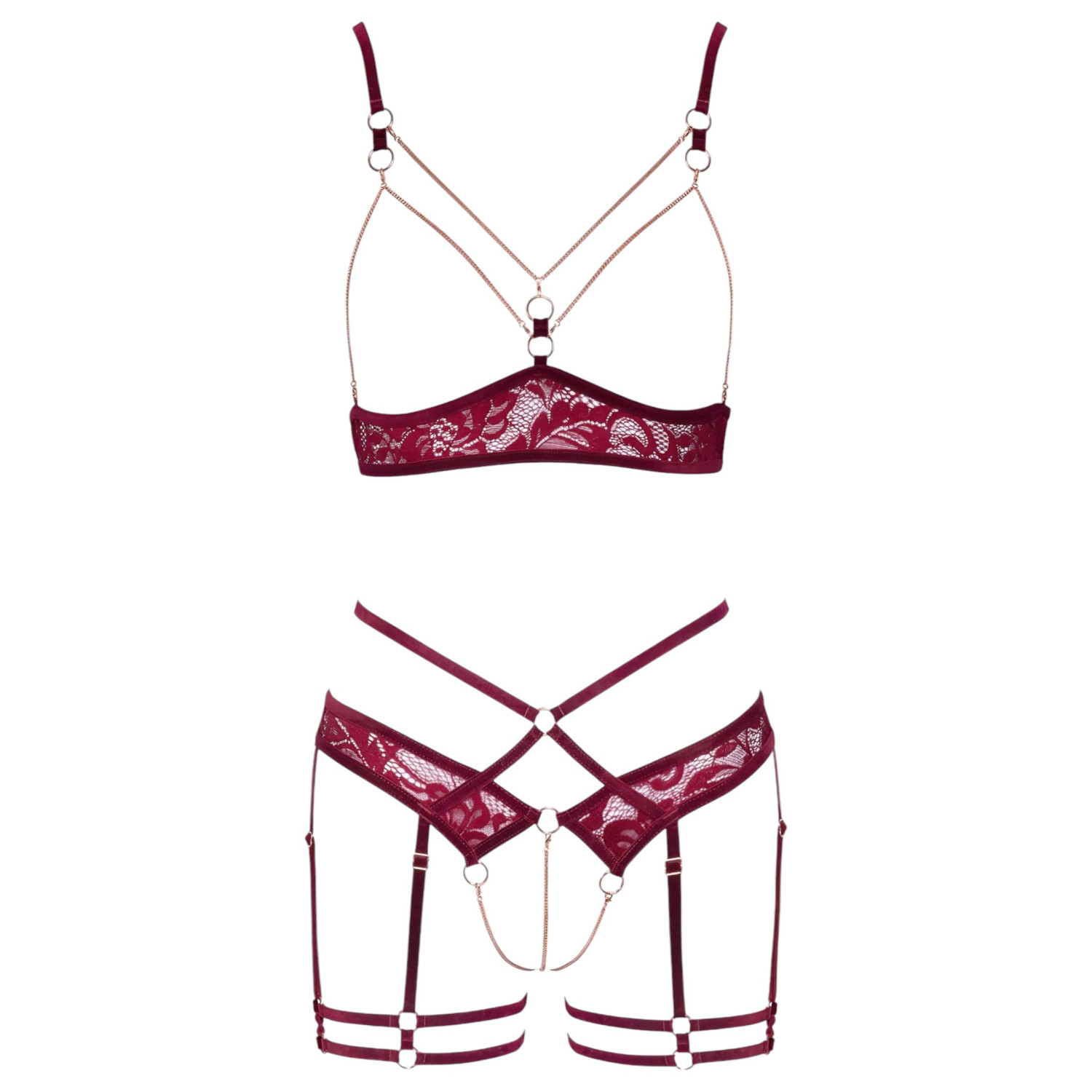 Acest set îndrăzneț este alegerea perfectă pentru cei care doresc să își exprime feminitatea în cea mai seducătoare formă. Designul deschis, dantela fină și detaliile speciale cu lanțuri asigură împreună un efect irezistibil.