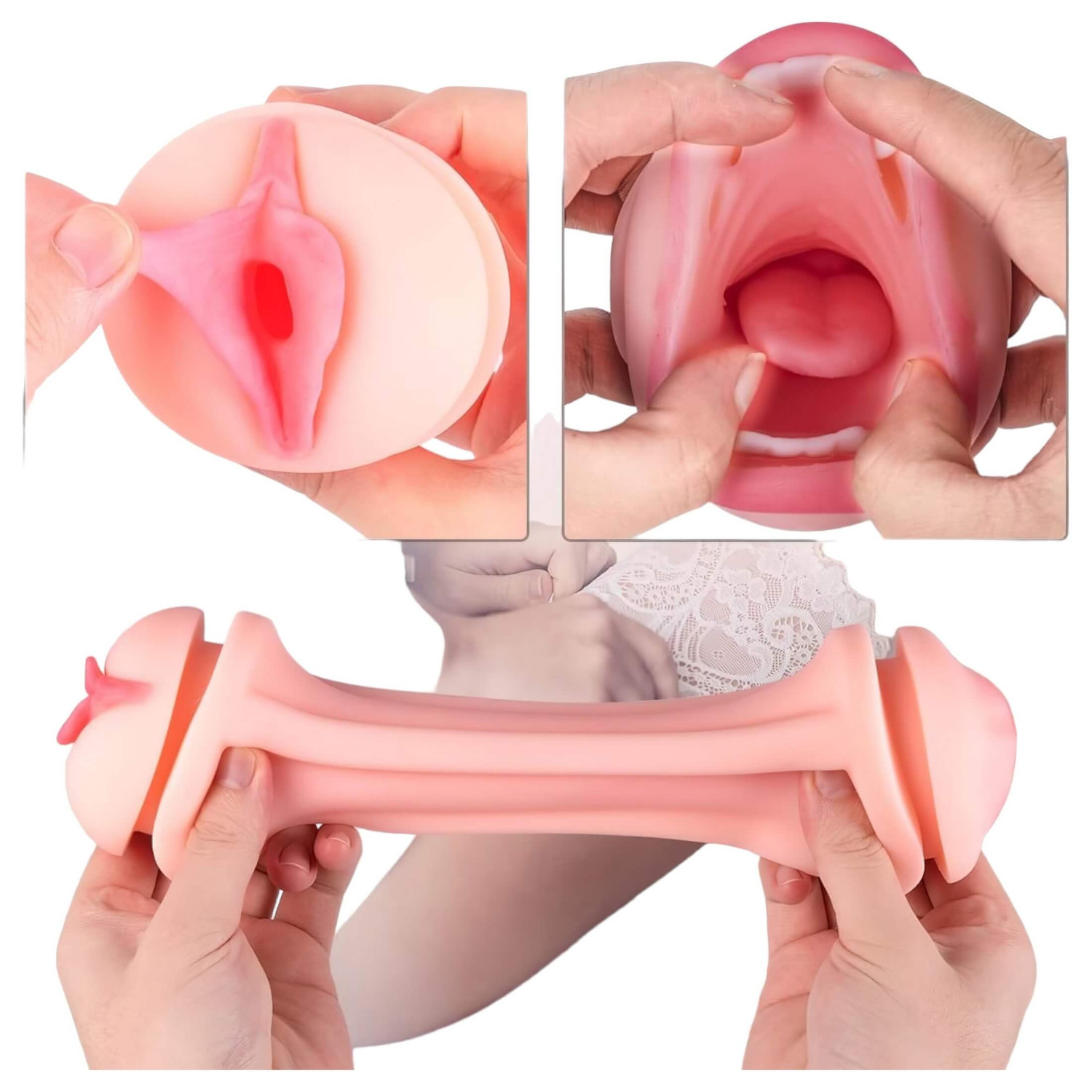 2în1 masturbator pentru bărbați: pe o parte o gură realistă, pe cealaltă parte o păsă caldă.Alegi tu dacă ai chef de sex oral sau vaginal!